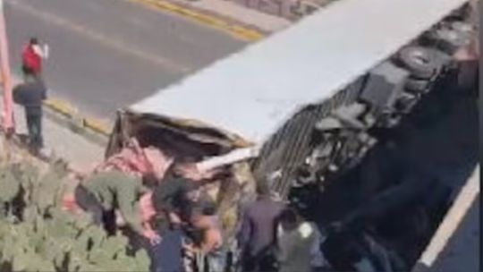 Según testigos, el camión chocó contra una camioneta utilitaria que llevaba helado. Por el impacto, el transporte cayó del puente de unos cinco metros de altura, golpeando contra el asfalto, lo que generó que la cabina quede totalmente destruida y el acoplado volcado sobre la calle.
